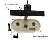Die Bewässerung erfolgt durch das Einfüllen von Wasser auf den Schwimmer. Der Wasserbehälter fasst maximal 1,5 Liter. Achten Sie darauf, ihn nicht zu überfüllen. Lassen Sie immer einen Abstand von etwa einem Zentimeter zwischen Schwimmer und Deckel, damit Ihre Pflanzen nicht ertrinken.