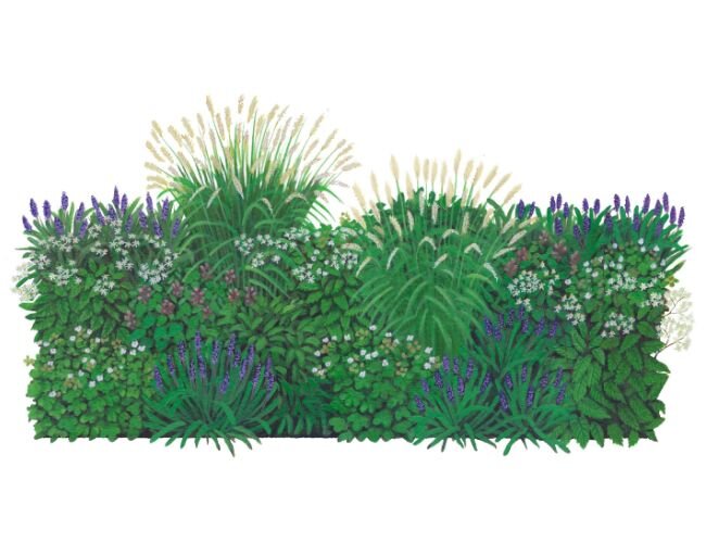 Bei Liriope, Helleborus und Geranium nicht zurückschneiden; verblühte Blütenstände entfernen, um ein immergrünes Beet zu erhalten